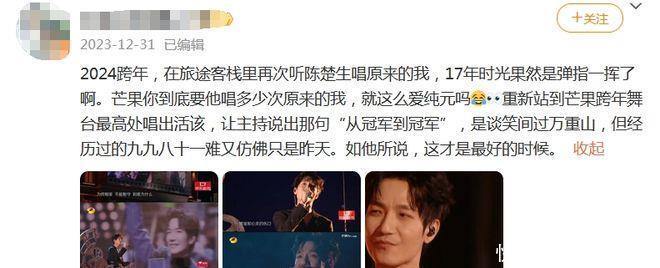 不外就像另外一些老粉叹息的那样,粉丝们合计抓马归抓马,但关于陈楚生本东谈主来说,从他本年插足《坚苦超过》,再到重回湖南台的跨晚,其实更多的如故息争吧,听他再唱起《原来的我》当然亦然让东谈主叹息良深。